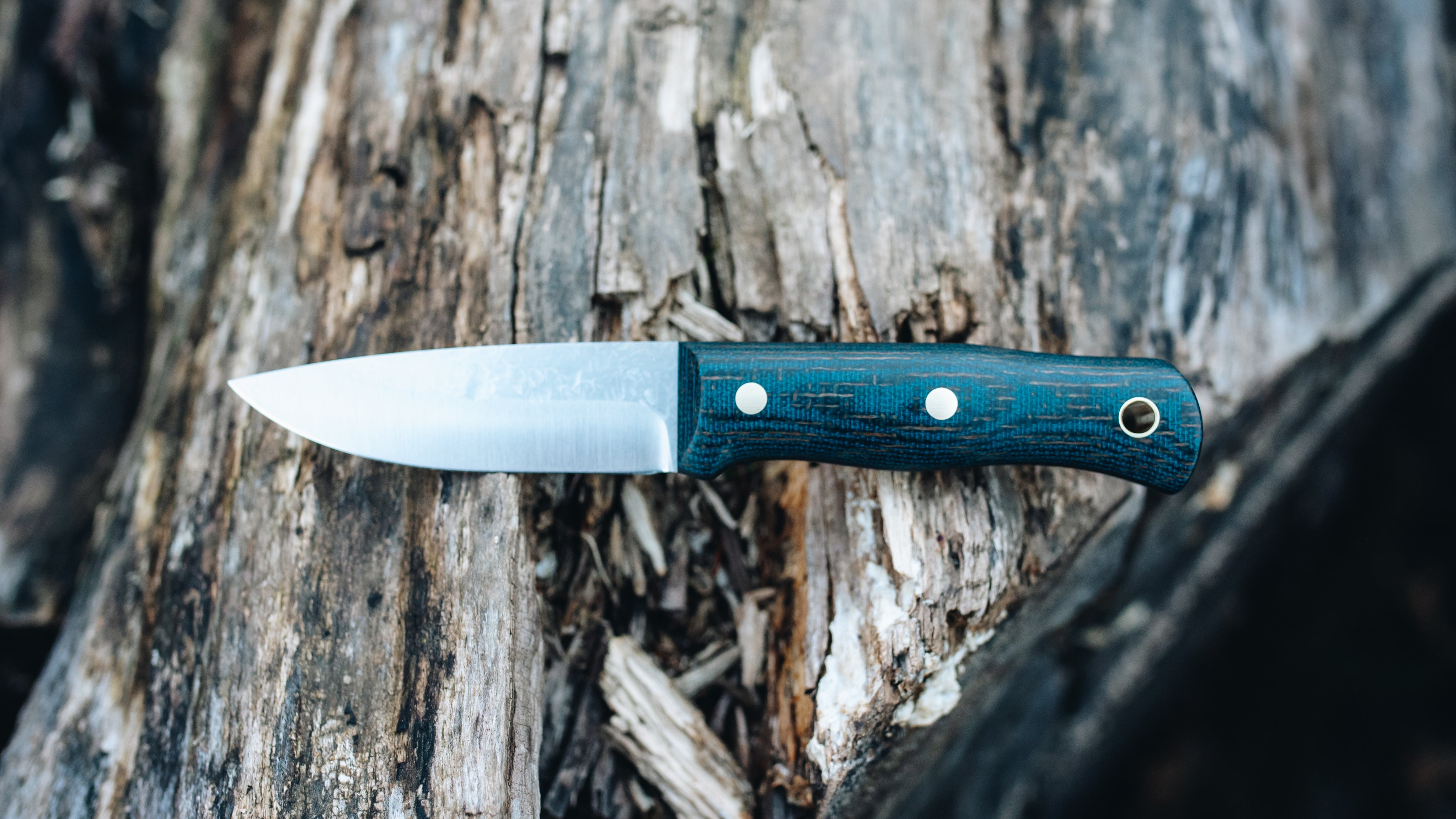 Blue canvas/burlap micarta with 1/8" black canvas liners, and brass hardware.