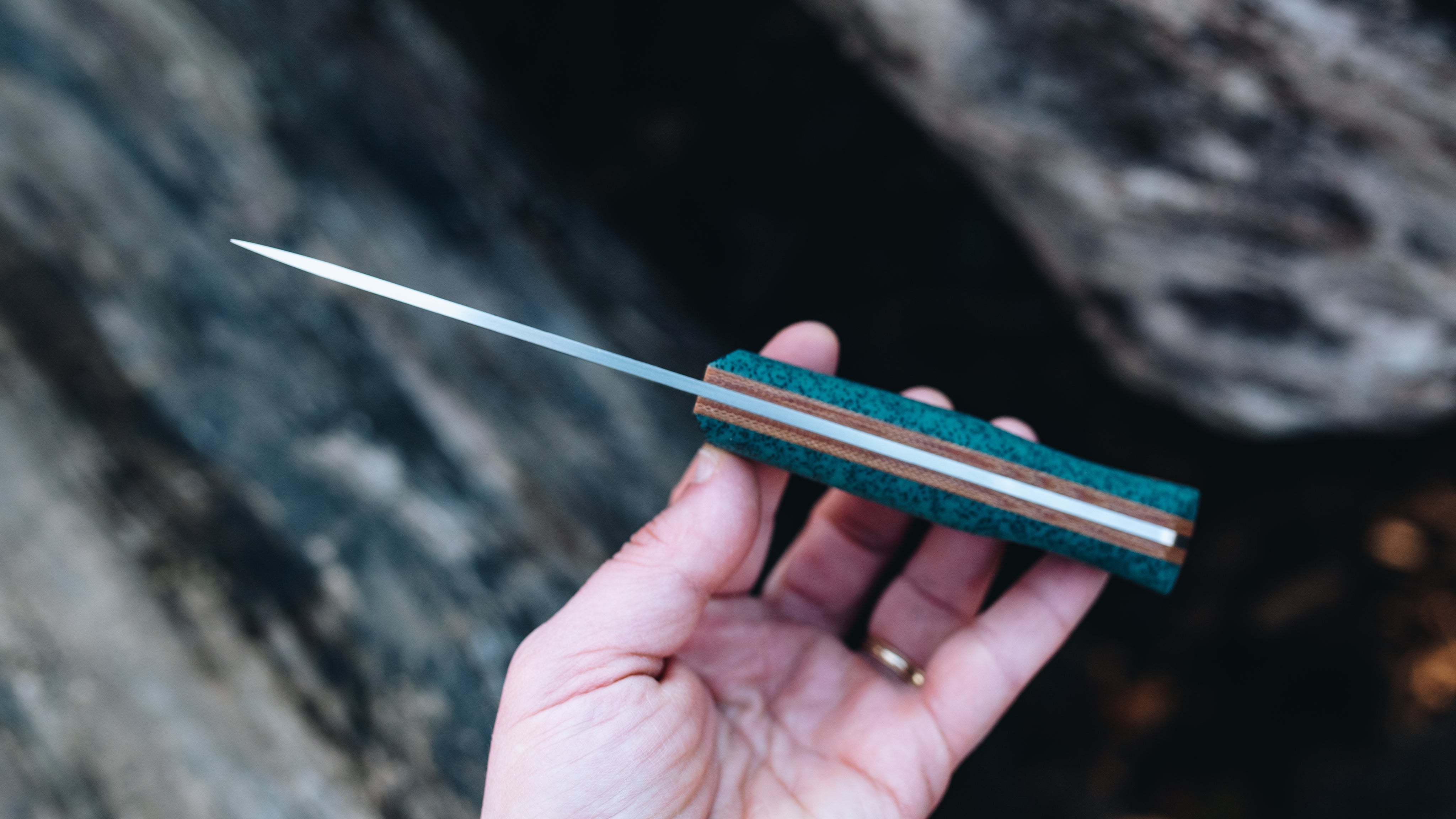 Viridian blue GripX with 1/8" brown canvas liners, brown micarta and brass hardware.