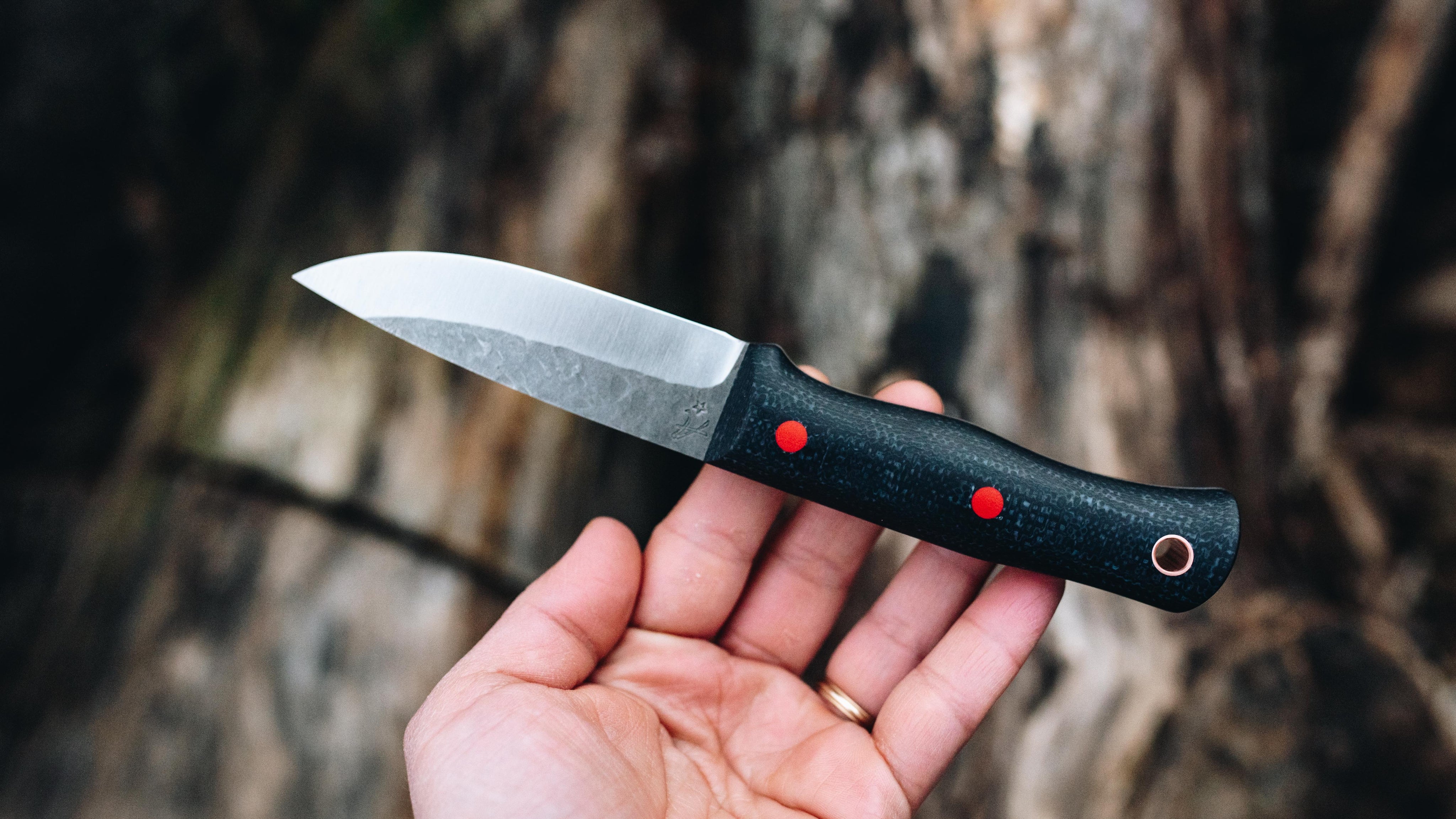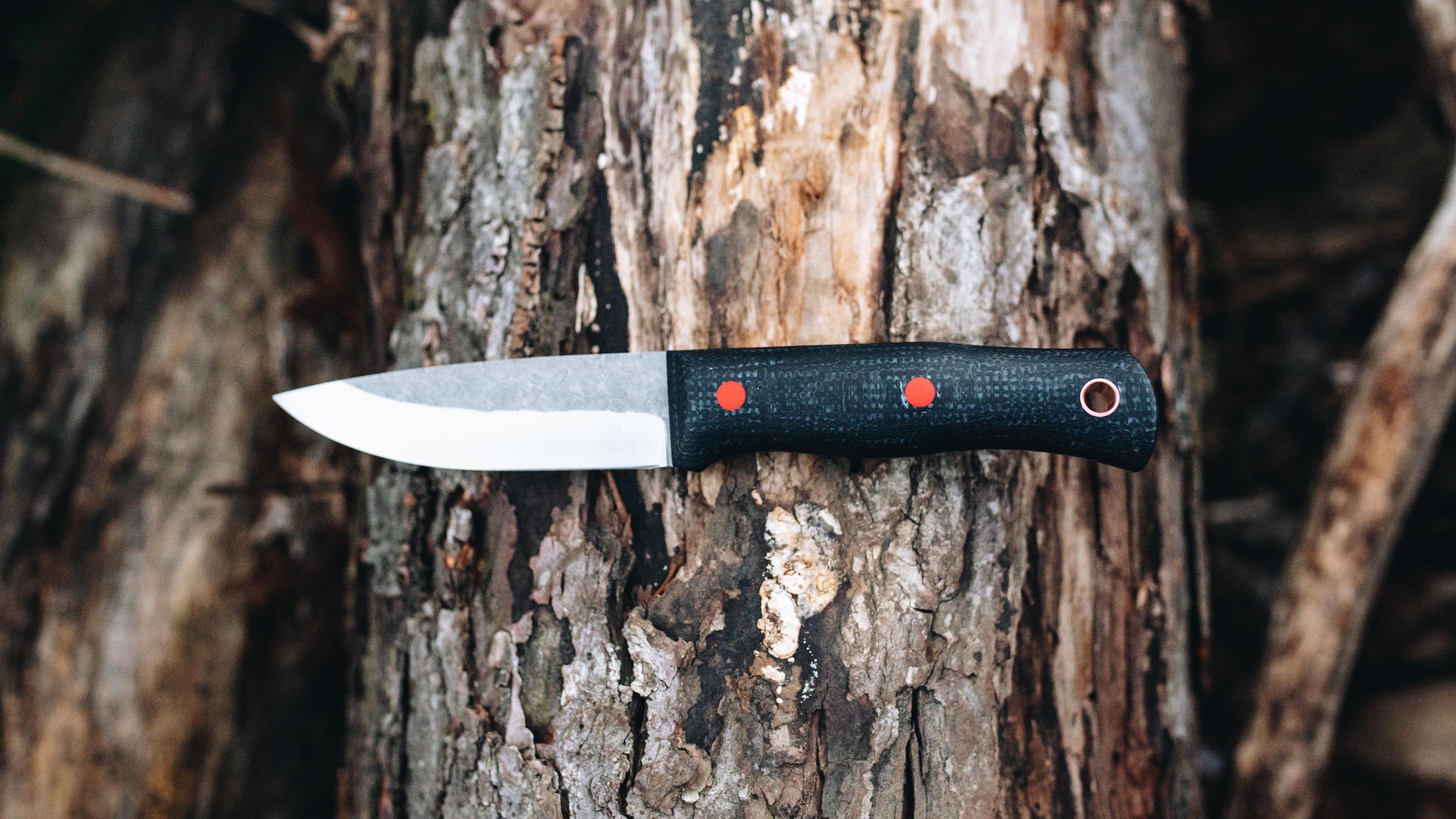 Black jute micarta with red G-10 and copper hardware.